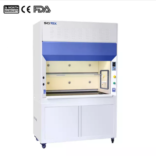 FMH (DA) series Fume Hood is designed as a negative pressure ventilation system that ensures the safety of operators and the laboratory environment. It works by drawing room air inward through the front opening of the hood and continuously ventilating it with an extraction blower. This prevents the spread of contaminated fumes, vapors, toxic gases, aerosols, and corrosive substances that may be generated during experiments. Furthermore, an optional active carbon filter can purify the polluted air before it is exhausted through the duct, thereby protecting the outdoor environment as well.